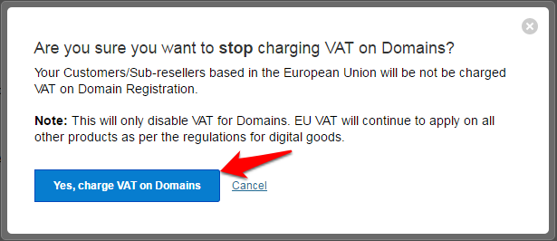Click on the Yes, stop charging VAT on Domains button to confirm.