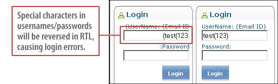 • Textboxes requiring user input [Username, Password, etc.]: If the Username or Password has some special characters, the order of the special characters will be reversed. This will result in login failures.
